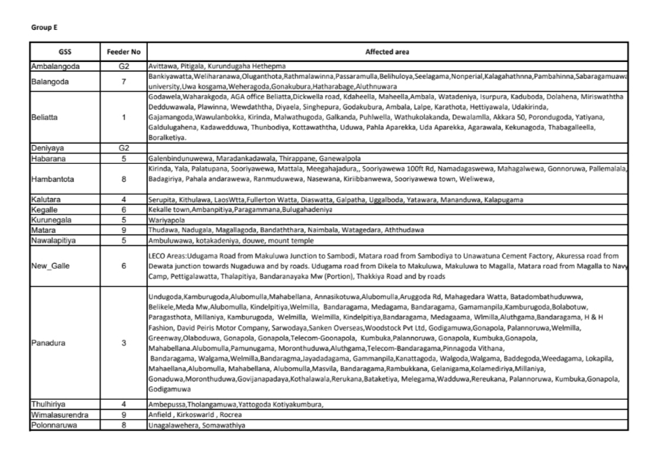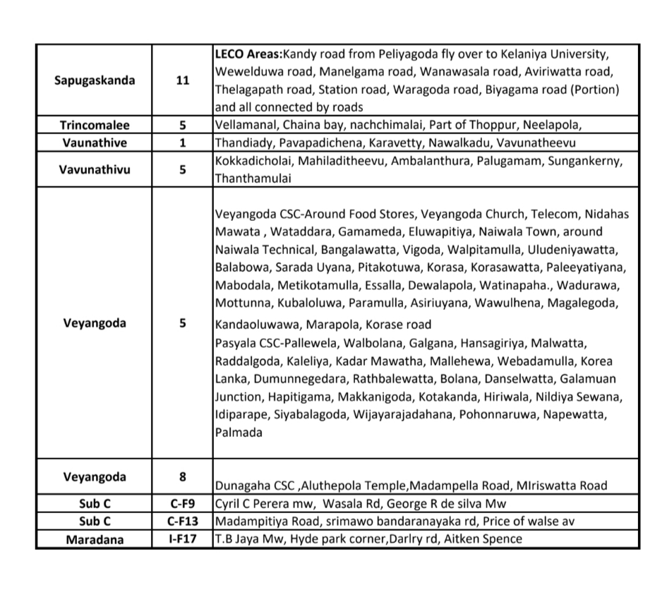 මේ අනුව අද දිනයේ විදුලි ක්පාදුව සිදු කරන සියලු ප්රදේශයන් පැහැදිලිව පහත කාල සටහනින් දැනගන්න.