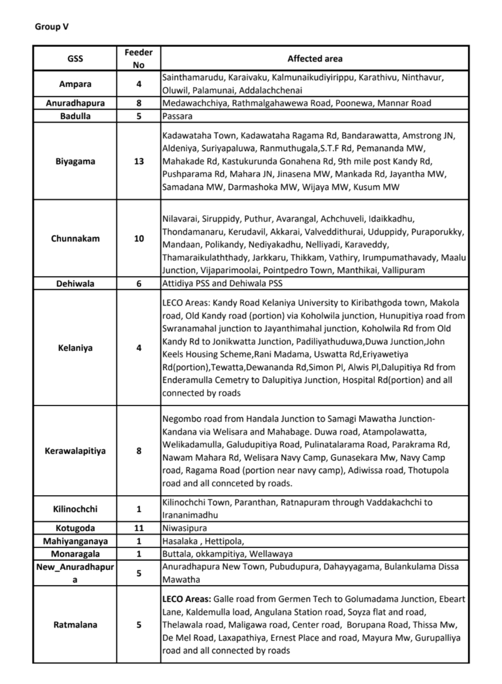 ‘ඒ’ සිට ‘එල්’ කලාප 12 කට පෙරවරු 8.00 සිට පස්වරු 6.00 දක්වා දහවල් කාලයේ පැය 2 යි විනාඩි 30 ක් ද, පස්වරු 6.00 සිට රාත්රී 11.00 දක්වා පස්වරුවේ පැයයි විනාඩි 15 ක් ද, ‘පී’ සිට ‘ඩබ්ලිව්’ දක්වා කලාප අටට පස්වරු 5.00 සිට රාත්රී 9.00 දක්වා පස්වරු කාලයේ පමණක් පැයක් විදුලිය කප්පාදු කරන බවත් මහජන උපයෝගිතා කොමිසම පවසනවා.